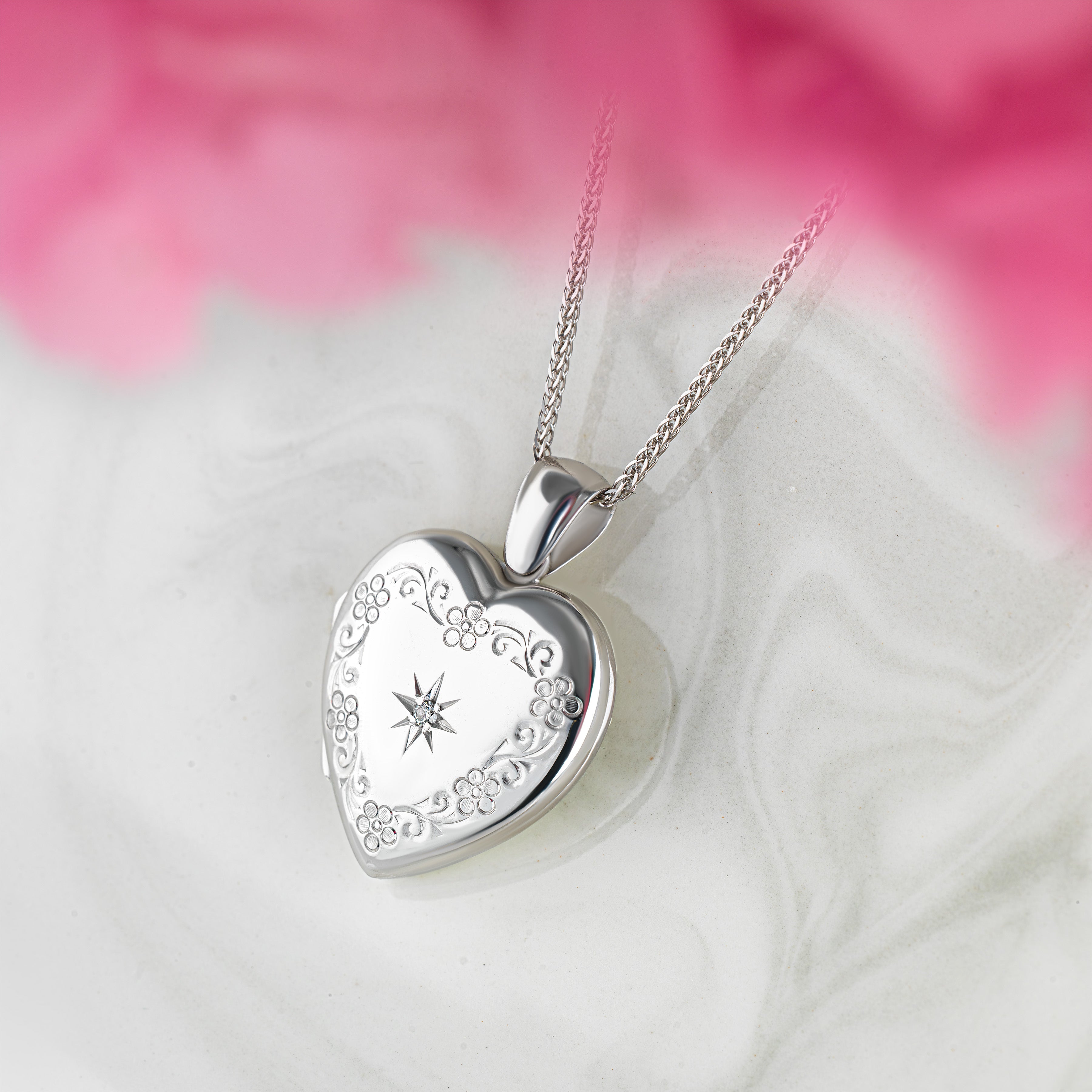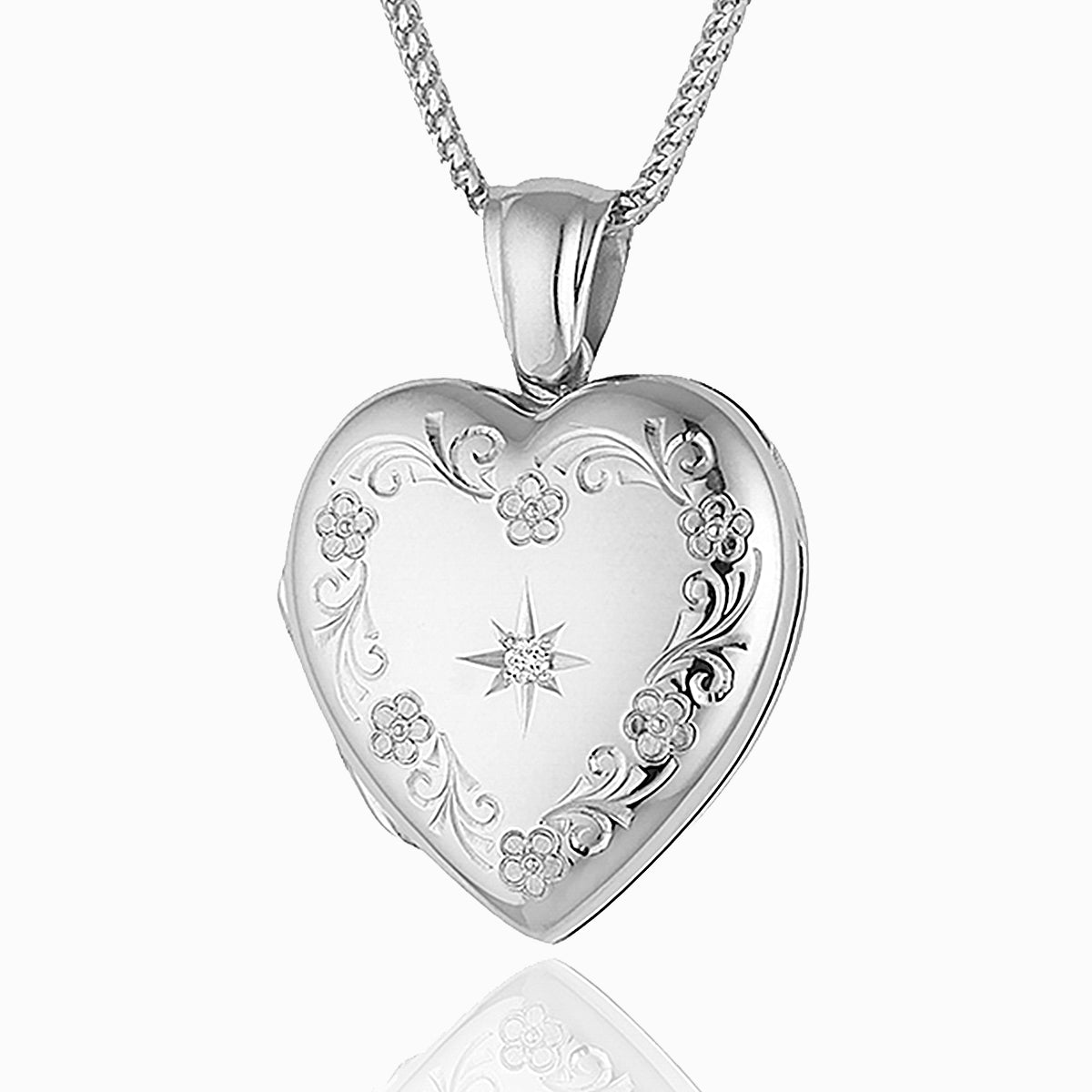 An elegant and timeless hand made 18 ct white gold heart-shaped locket engraved with a floral border and a star set diamond in the middle.