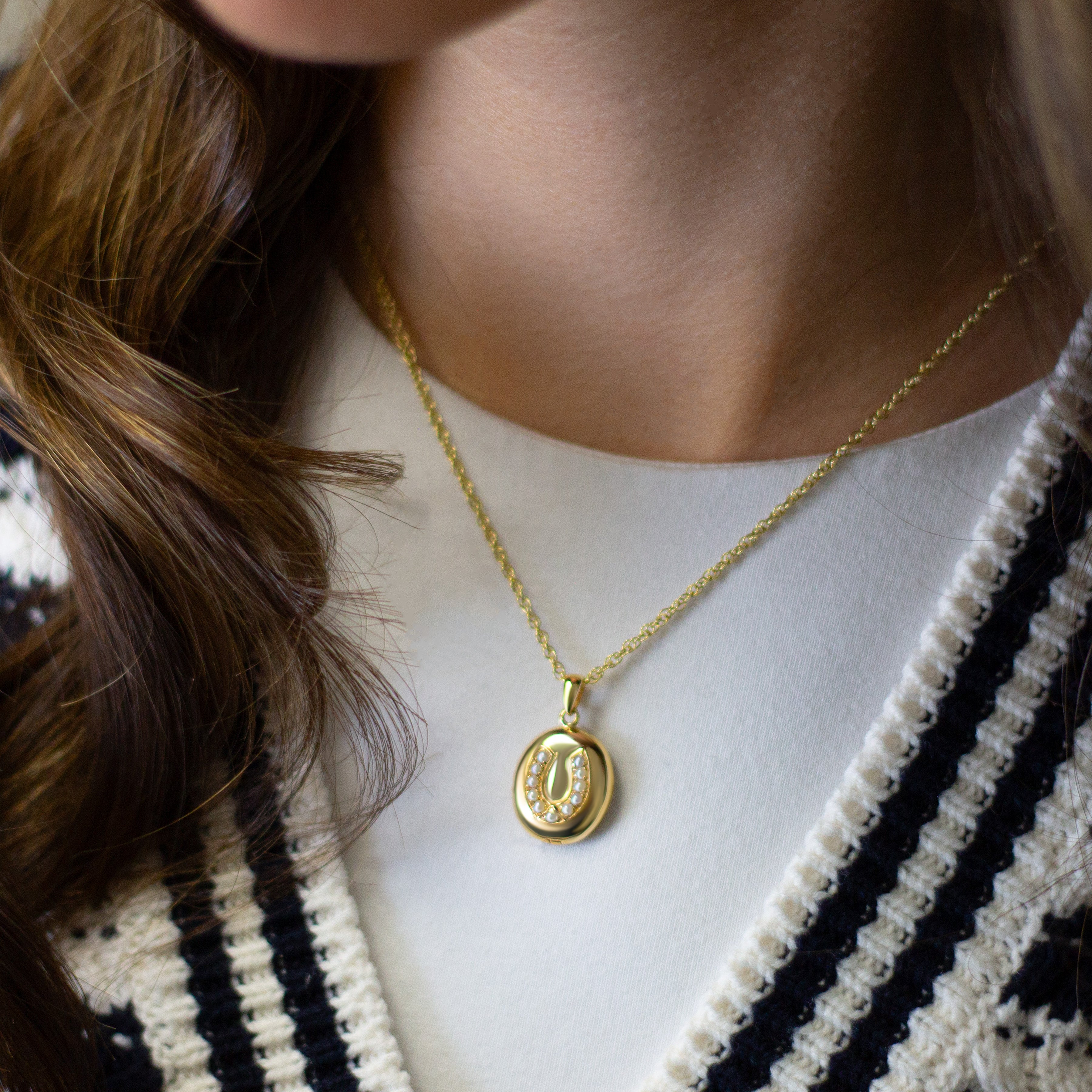 A sweet 9 ct gold locket set with 11 freshwater pearls in a horseshoe design. A great equestrian gift and perfect for everyday wear. The horseshoe is a symbol of good luck and protection.