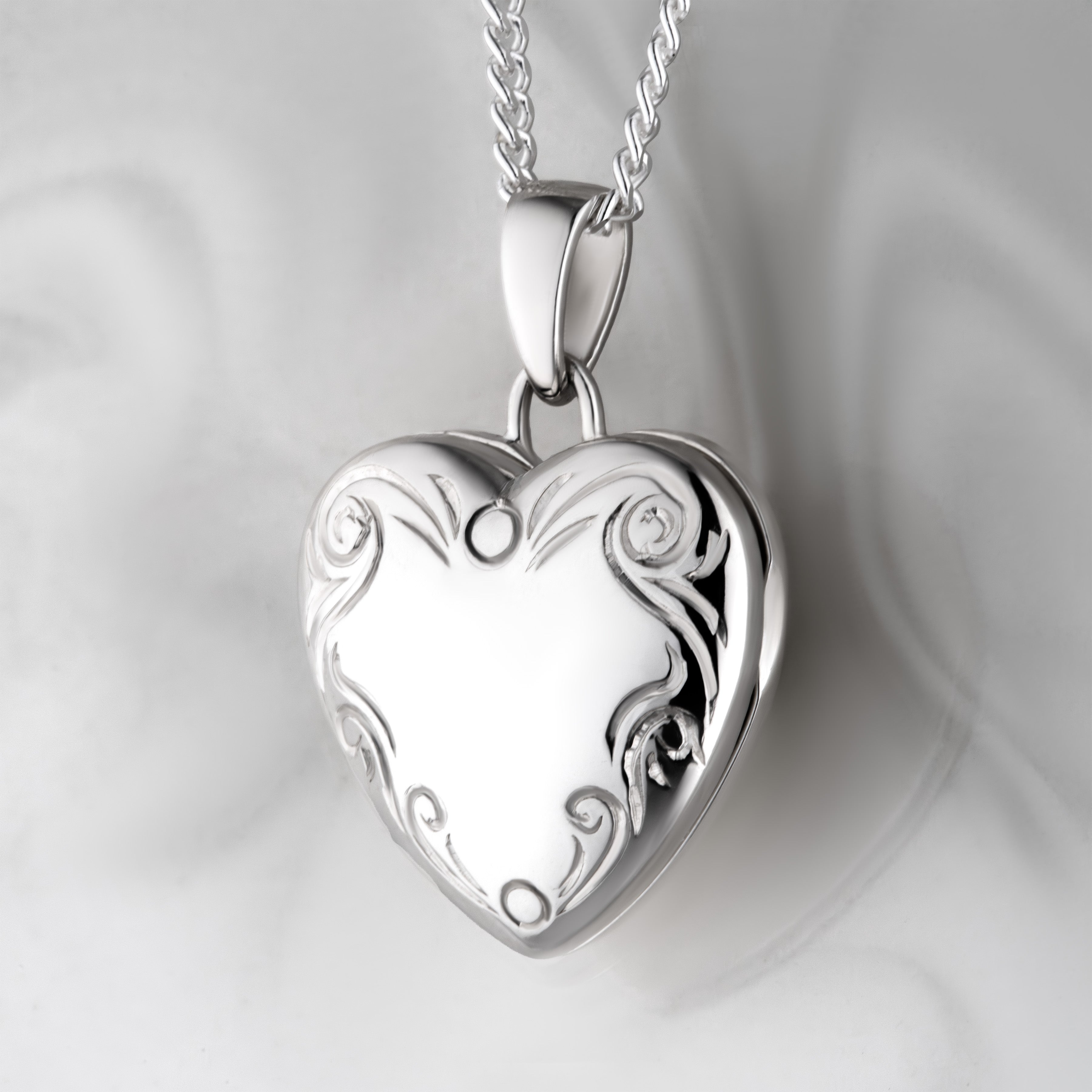 A premium sterling silver heart-shaped locket, hand engraved with a foliate border design. The locket opens to reveal two lined photo compartments, with perspex insets.