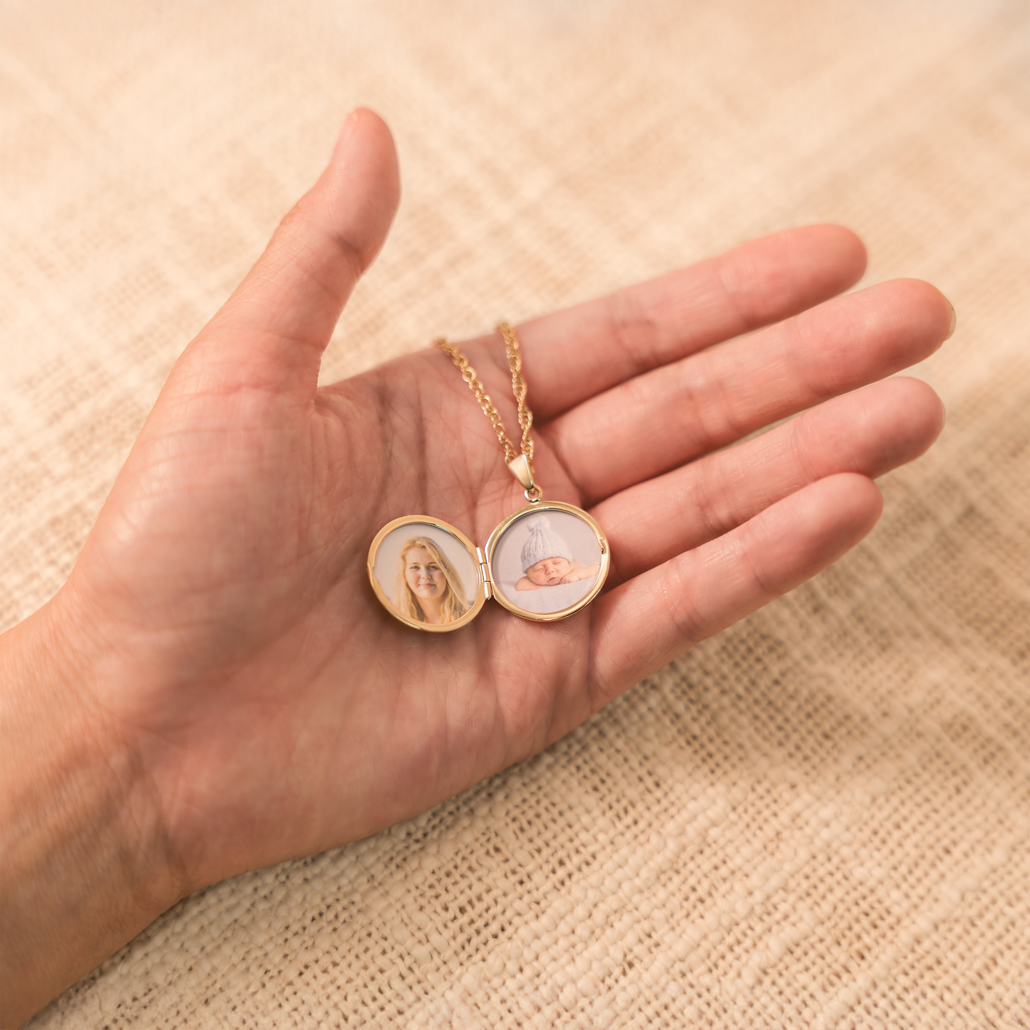 The locket is shown with a matching gold chain for illustration purposes, but the chain is not included by default. If you would like to purchase a chain, please select your preferred option from the drop-down menu below.