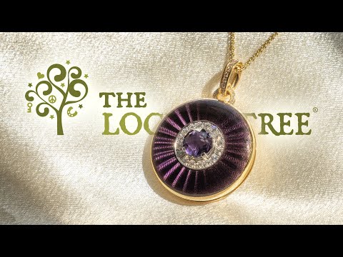 An 18ct gold handmade round locket set with diamonds, including on the bail, a central amethyst, and guilloche enamel. This timeless locket is one to wear for all kinds of special occasions. Amethyst is the birthstone for the month of February and due to its beauty, this purple gem has become a very popular jewellery stone. It symbolises peacefulness and calms the mind and spirit.