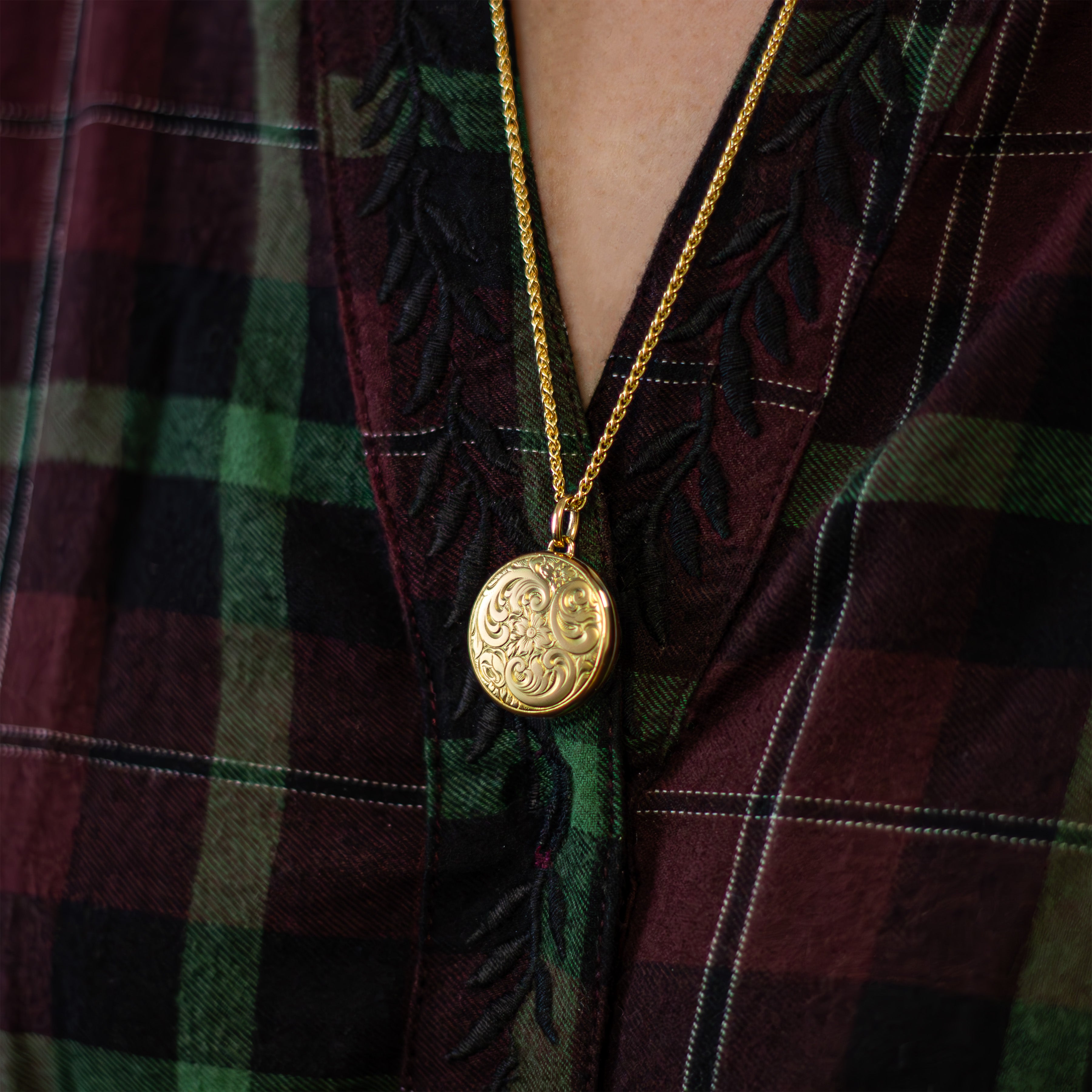 An 18 ct gold hand made round locket engraved with an intricate traditional floral design on a subtle satin finish.