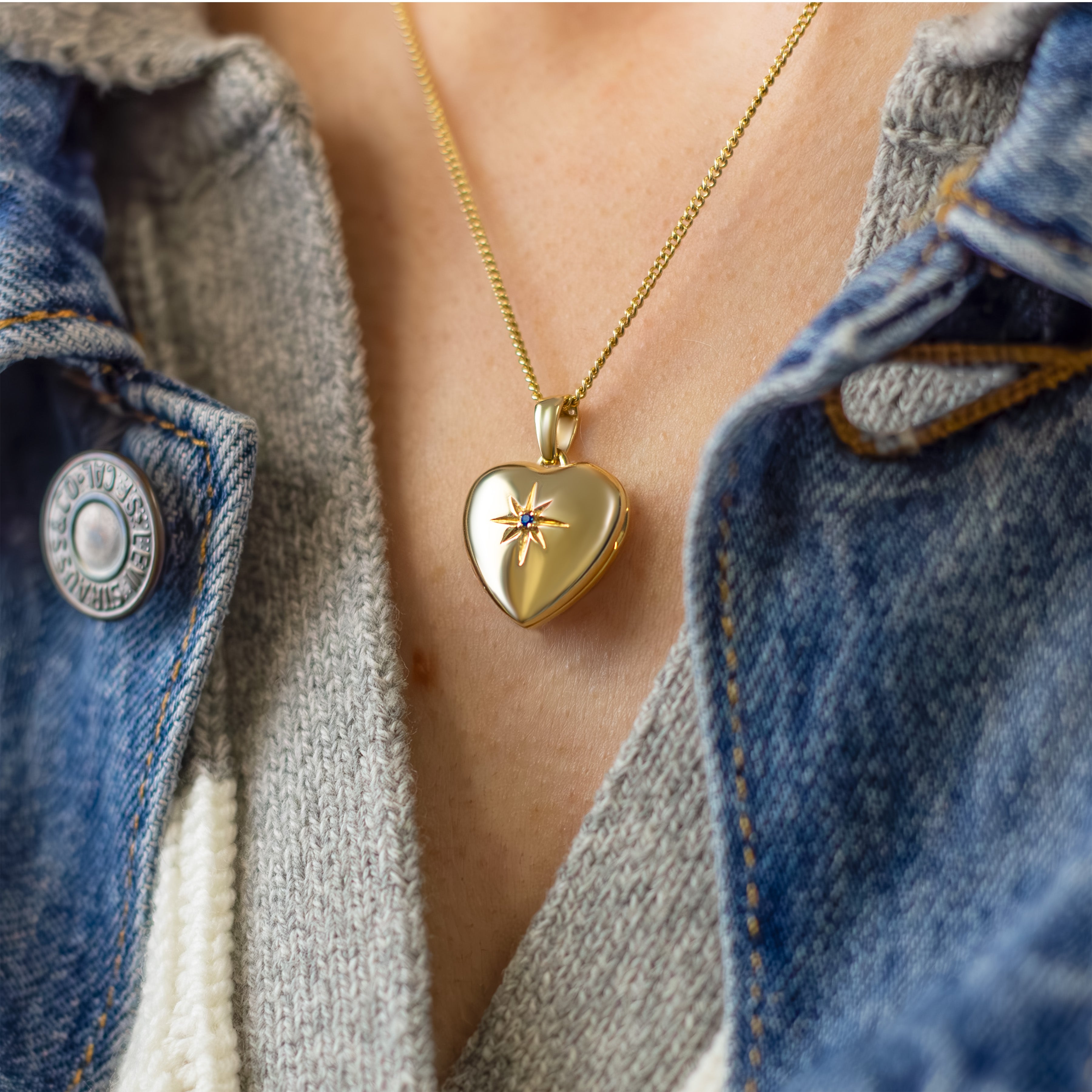 A gorgeous solid 9 ct gold heart locket star set with a natural sapphire.