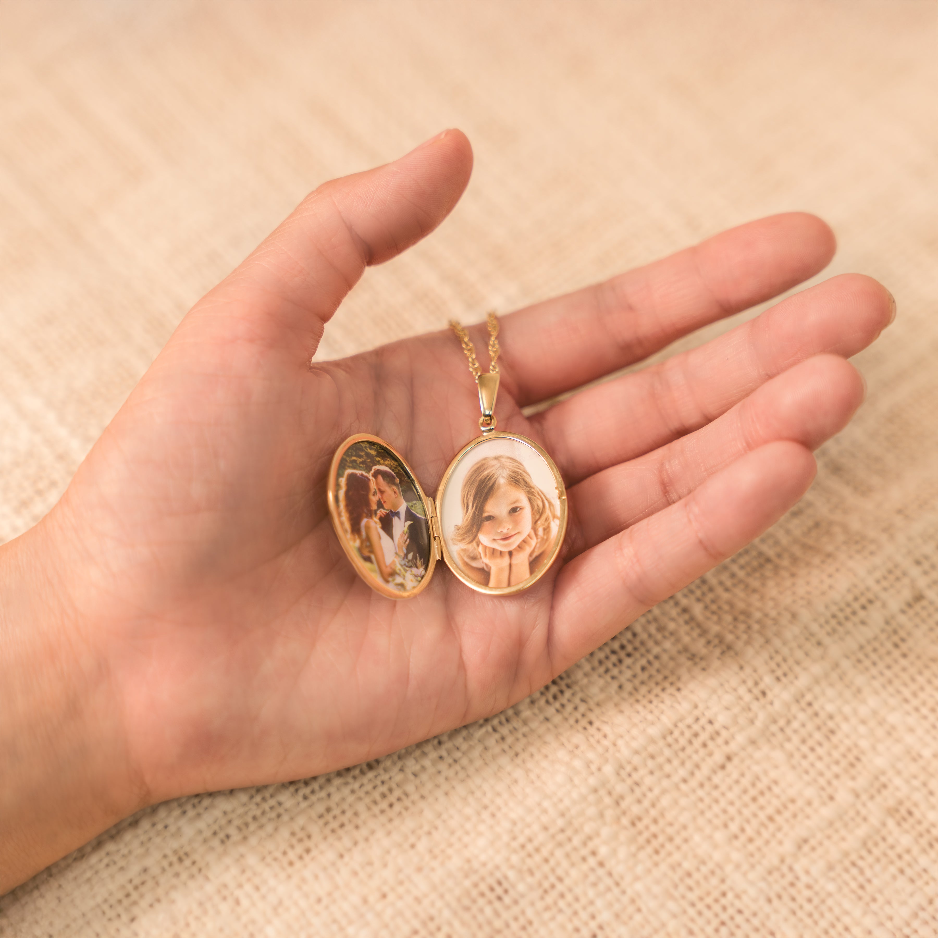 The locket is shown with a matching gold chain for illustration purposes, but the chain is not included by default. If you would like to purchase a chain, please select your preferred option from the drop-down menu below.