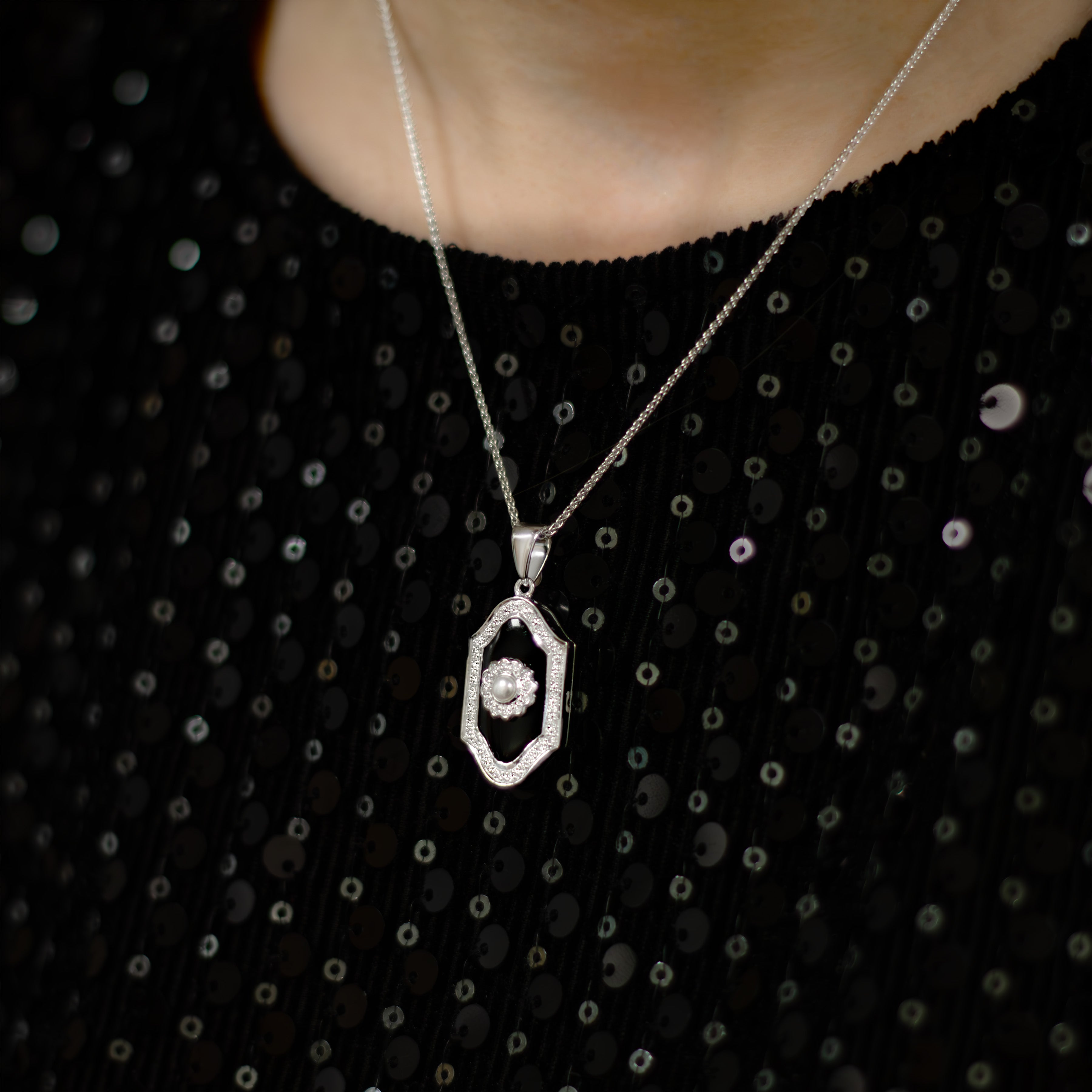 Diamond, Onyx and Pearl White Gold Locket