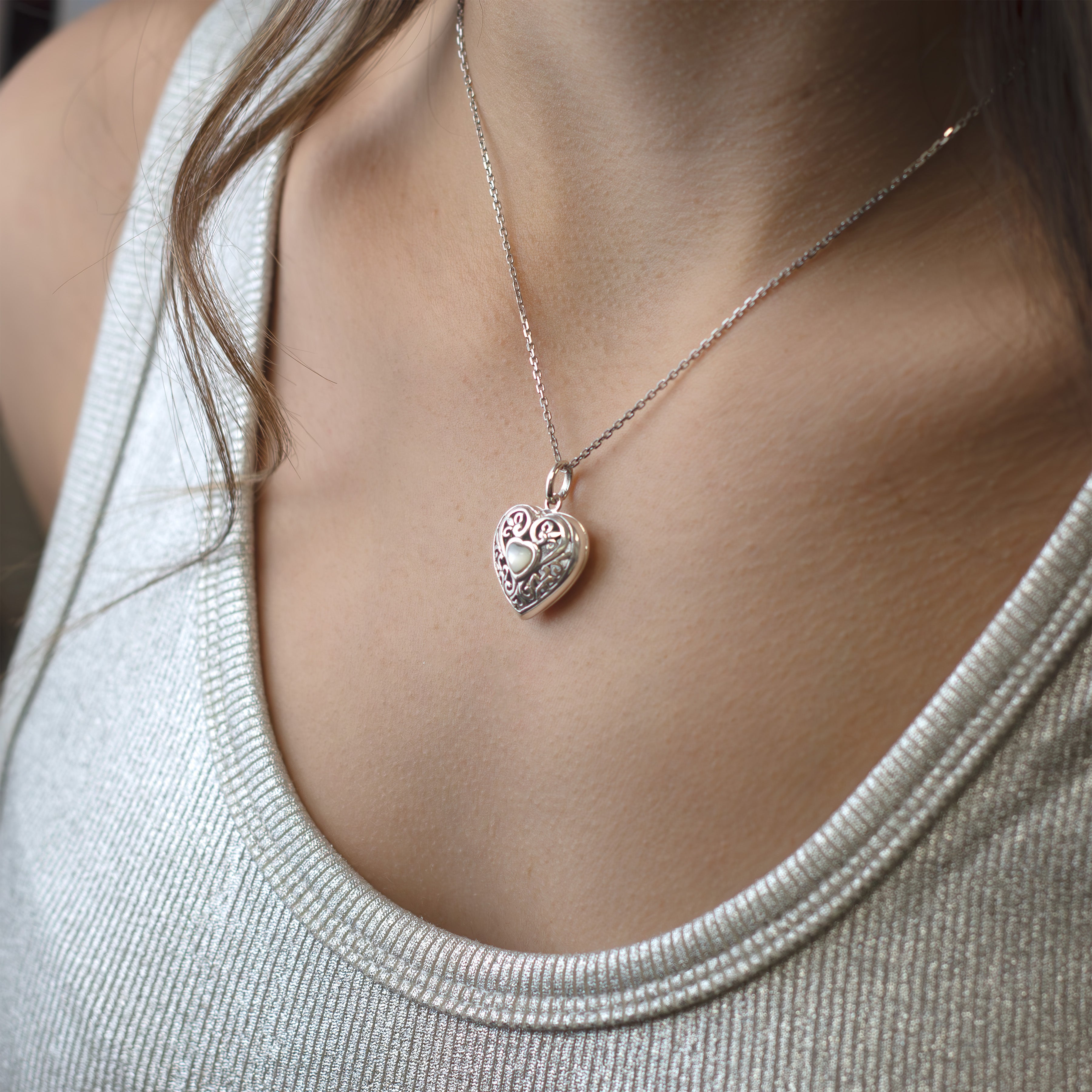 This sweet and dainty locket features a real mother-of-pearl set into an elegant 925 sterling silver heart shaped locket with intricate filigree detailing.