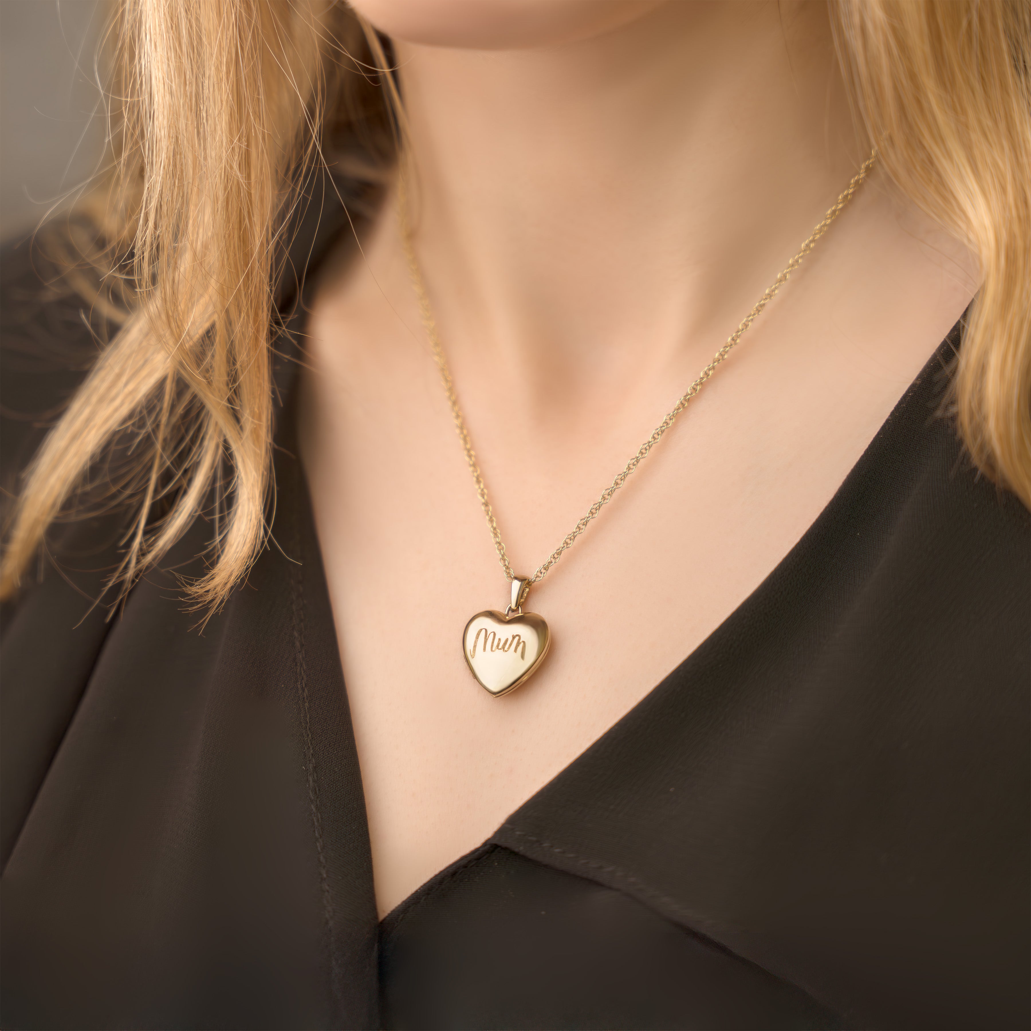 A solid 9 ct gold heart-shaped locket, engraved with the word Mum in a relaxed contemporary font.