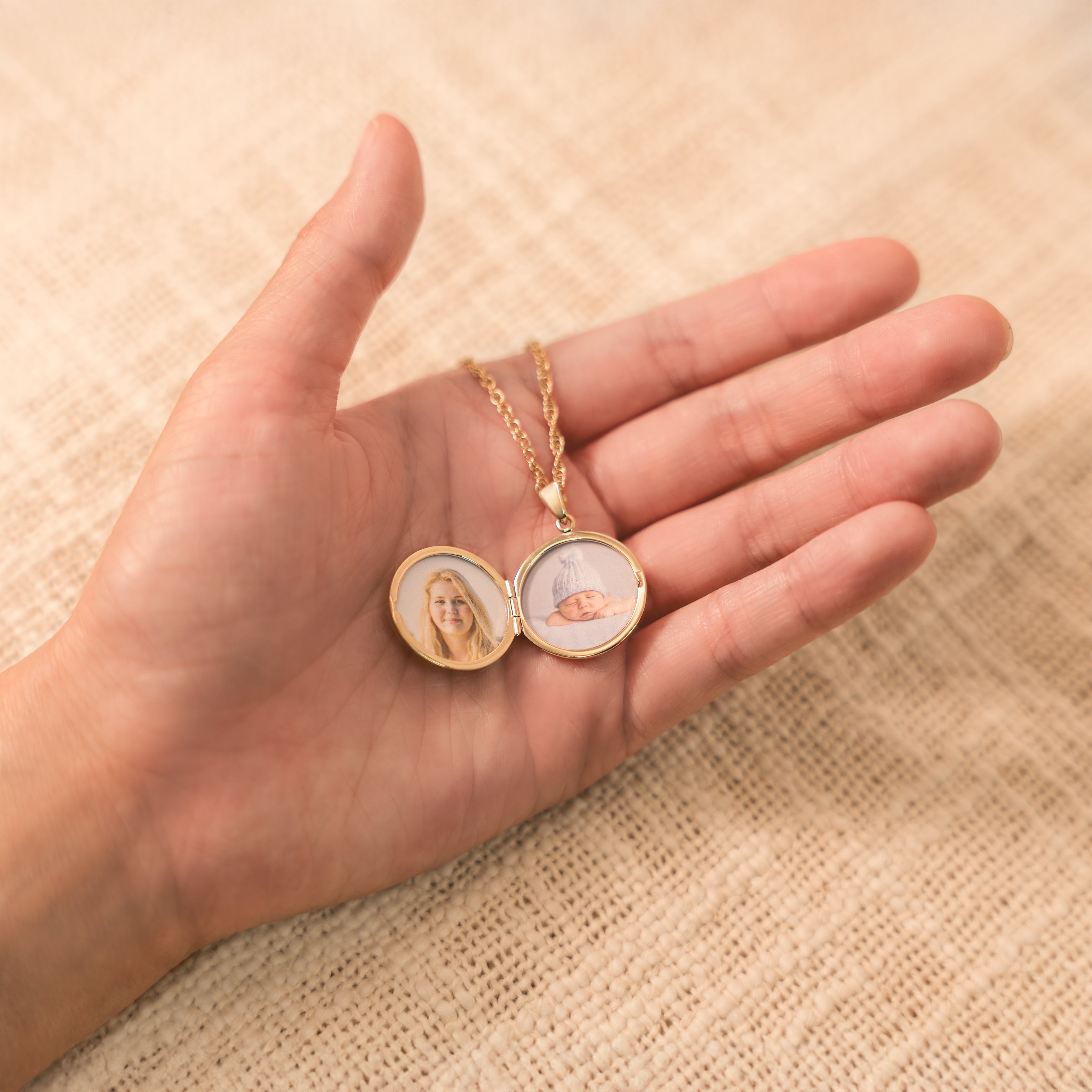 The locket is shown with a matching gold chain for illustration purposes, but the chain is not included by default. If you would like to purchase a chain, please select your preferred option from the drop-down menu below.